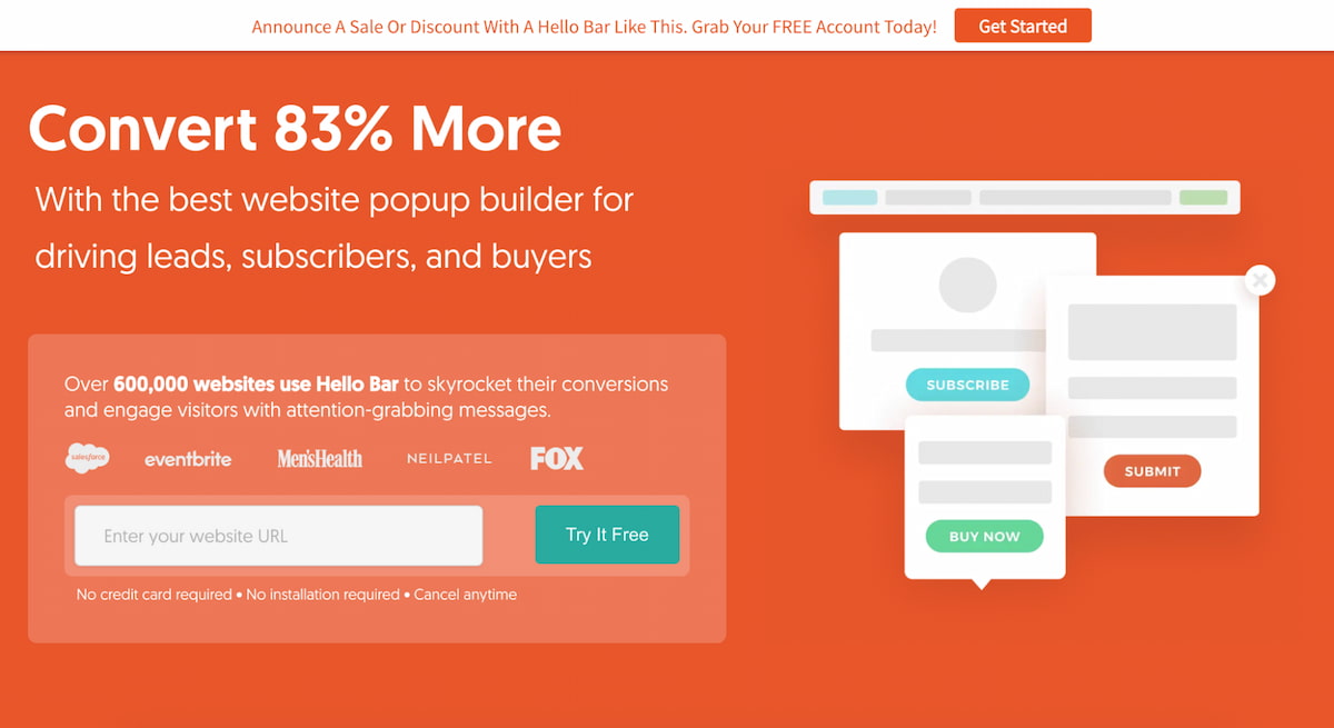 While Hello Bar might not be the best software for SaaS enterprises that need multi-level segmentation, its set of features is more than sufficient for startups and lean marketing teams. It’s easy to use and adjust, and the setup takes mere minutes.