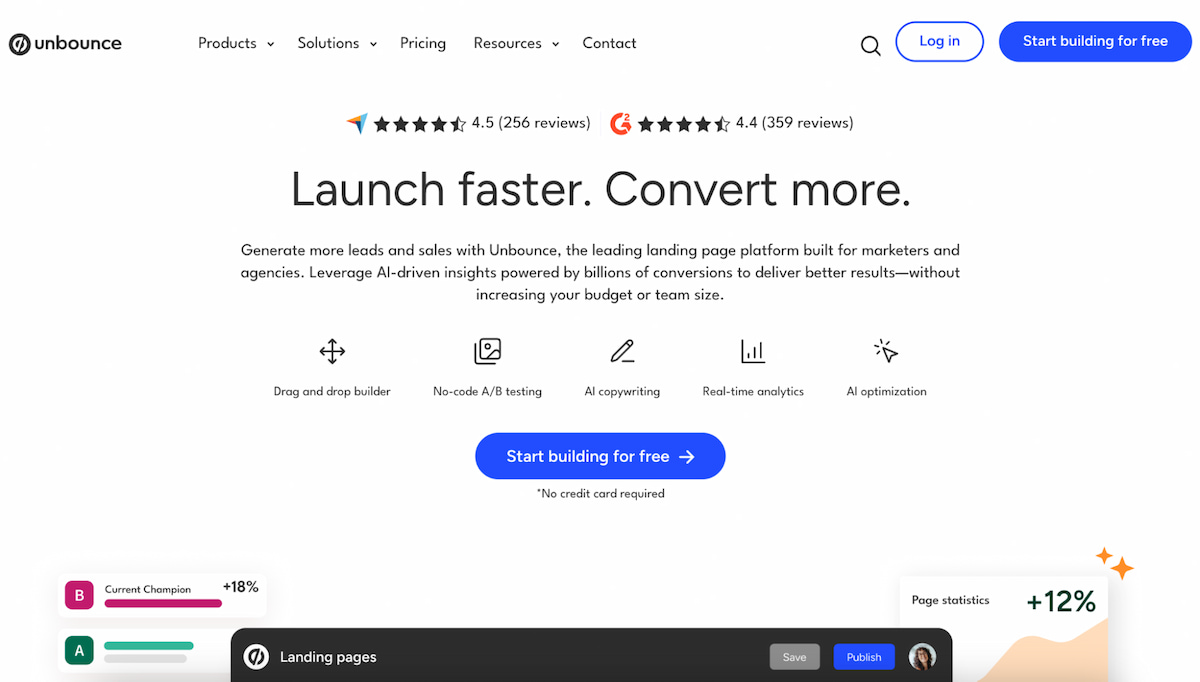 Unbounce makes it clear that their main focus is on testing and performance optimization. SaaS marketers who run high-volume campaigns have access to unlimited customization options, allowing them to experiment with layouts and forms. Instead of relying on gut feeling, you can act on the results of solid, structured tests.